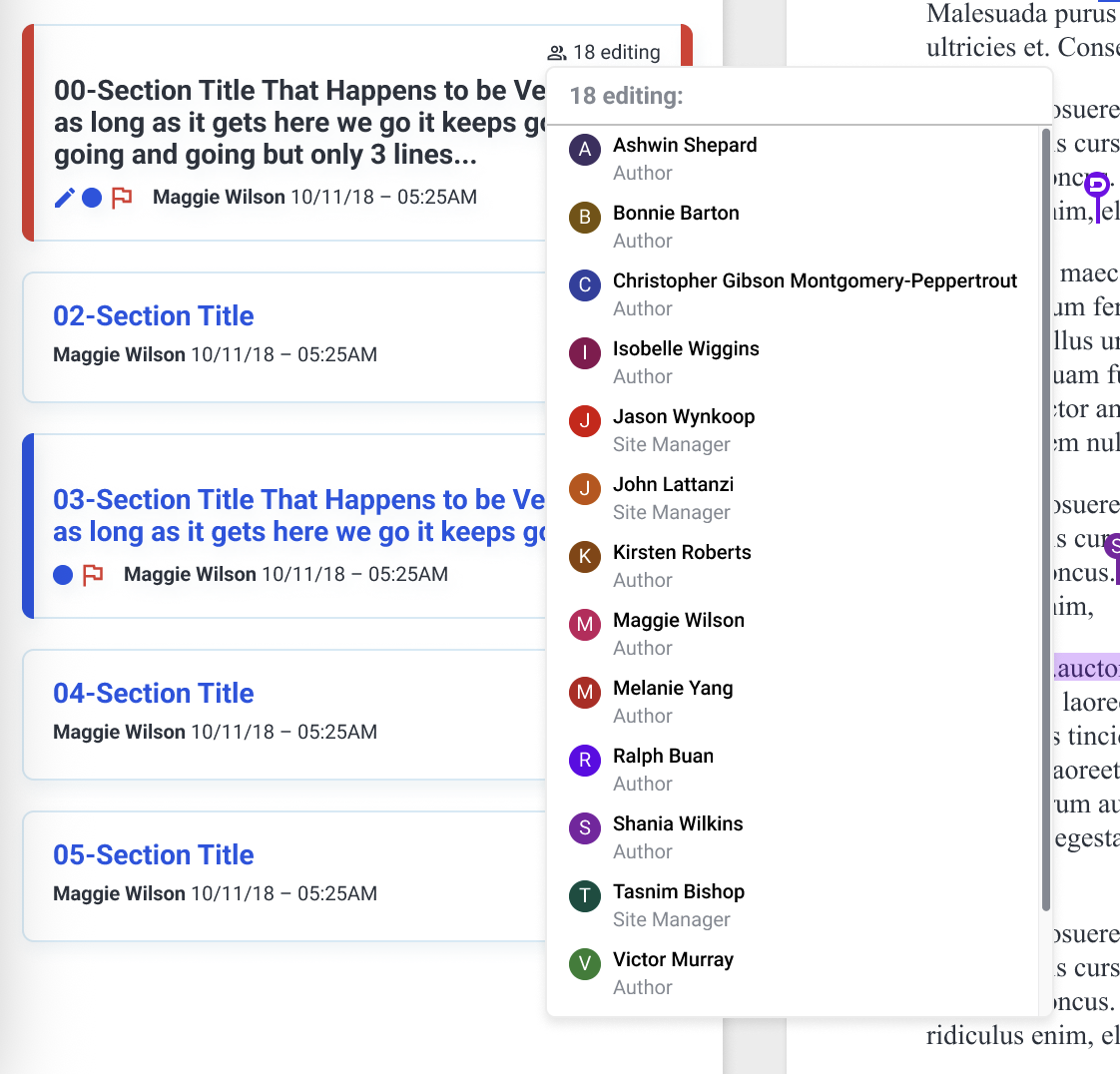 Many of the documents that clients compile require various users to add content, edit, review, and apply XBRL tagging. Due to restrictive timelines, the product must handle multiple users in the document at a time.